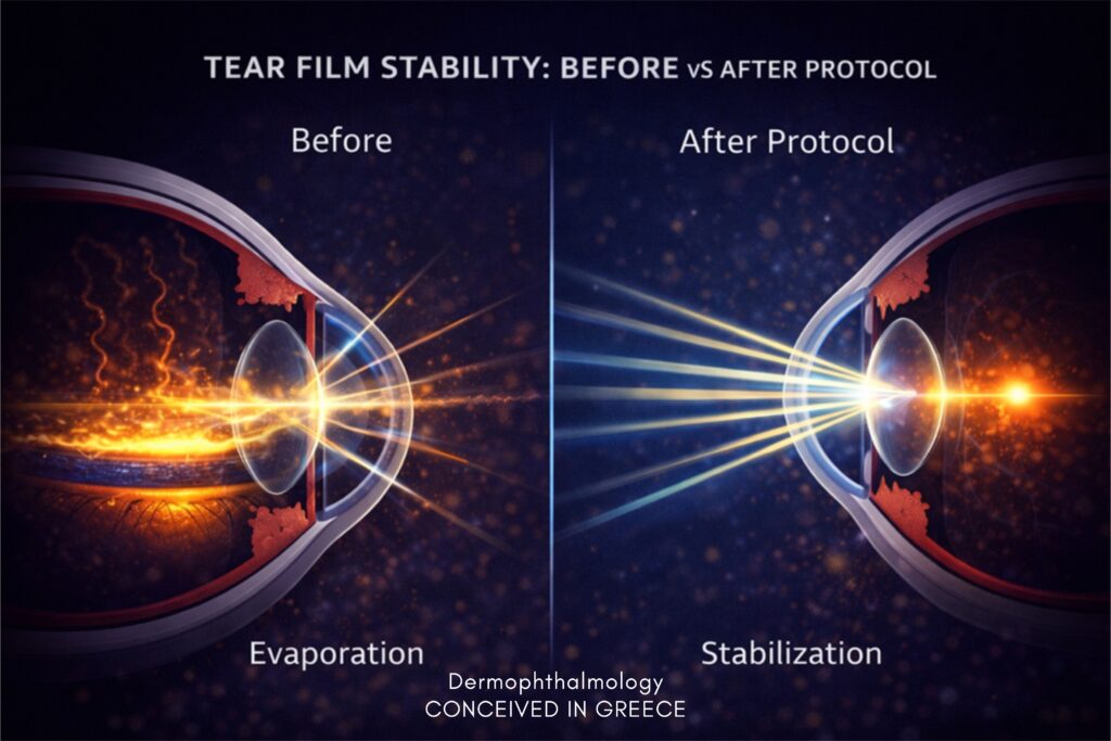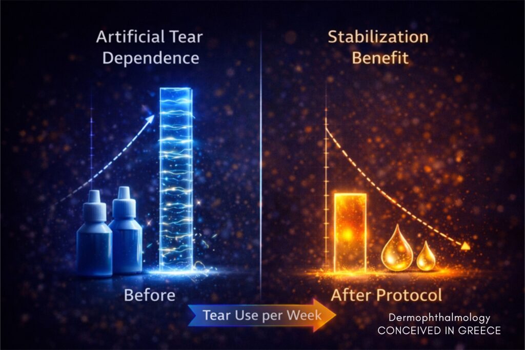 Και εδώ έρχεται το κρίσιμο:αν σταθεροποιήσεις το σύστημα των βλεφάρων/αδένων/λιπιδίων, τότε τα τεχνητά δάκρυα “πιάνουν” πολύ περισσότερο και κρατάνε πολύ παραπάνω.