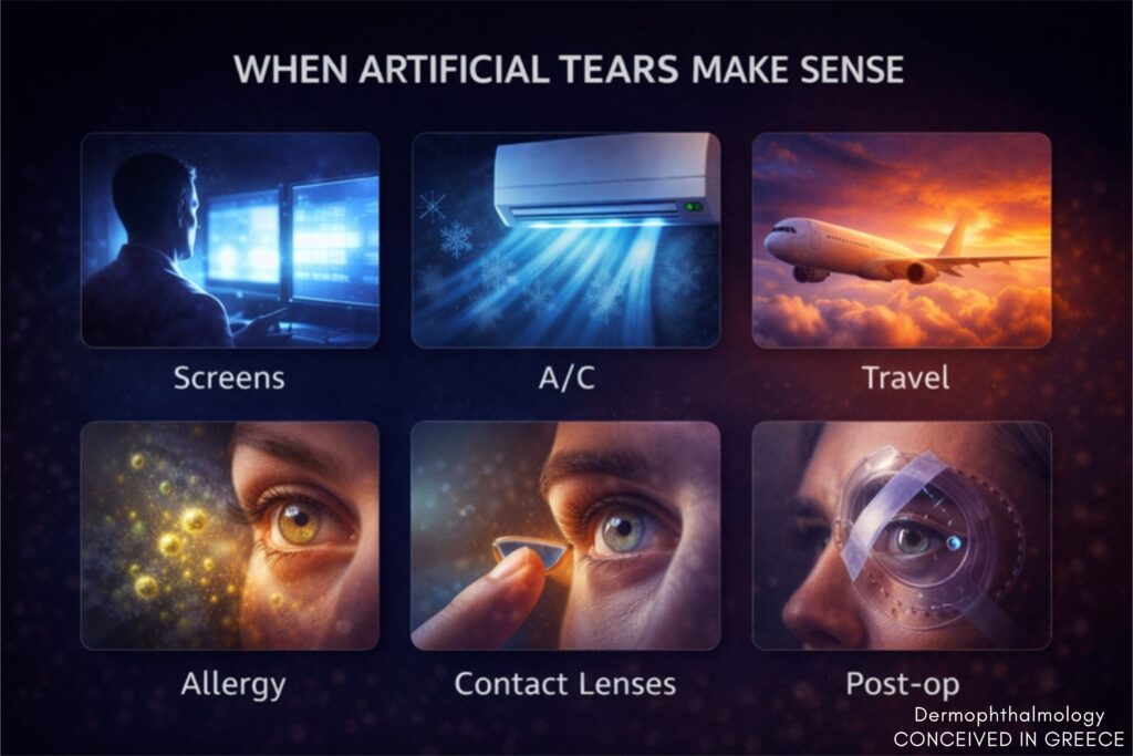 - Τεχνητά δάκρυα στοχευμένα όταν πραγματικά χρειάζεται (όχι ως “μόνο όπλο”)